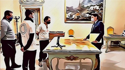 La scena aveva quattro possibili varianti. La migliore delle quali, sarebbe stata quella di una normale riunione. Conte avrebbe potuto invece rimanere seduto, lasciando gli ospiti in piedi. In tal caso, si sarebbe dimostrato maleducato, ma dando di sé l’idea di chi sa ponderare i messaggi che gli pervengono. In altre parole, lo si sarebbe ritenuto un cafone, però intelligente. La seconda variante consisteva nello stare in piedi, facendo sedere gli ospiti. Ne sarebbe risultata l’immagine di un uomo superiore, “in tutt’altre faccende affaccendato”, e dunque con poco tempo a disposizione: “de minimis non curat praetor”.